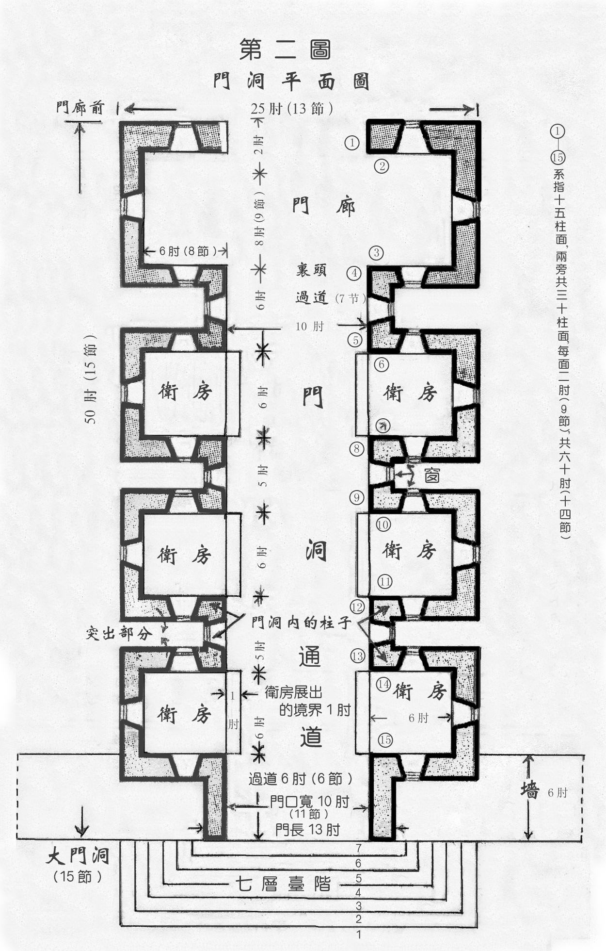 第四,门洞外头的过道。(六节。)大门洞共分四个部分。头一部分是外头的过道,第二部分是门洞的大通道,第三部分是里头的过道,第四部分就是门廊。一个人要进这大门洞,他必须先上七步的台阶,进到外头的过道,然后进了门洞的大通道。在这通道的两旁,各有三间卫房。把这门洞通道走过之后,就到了里头的过道。过了里头的过道,就进到门廊,那就是缓