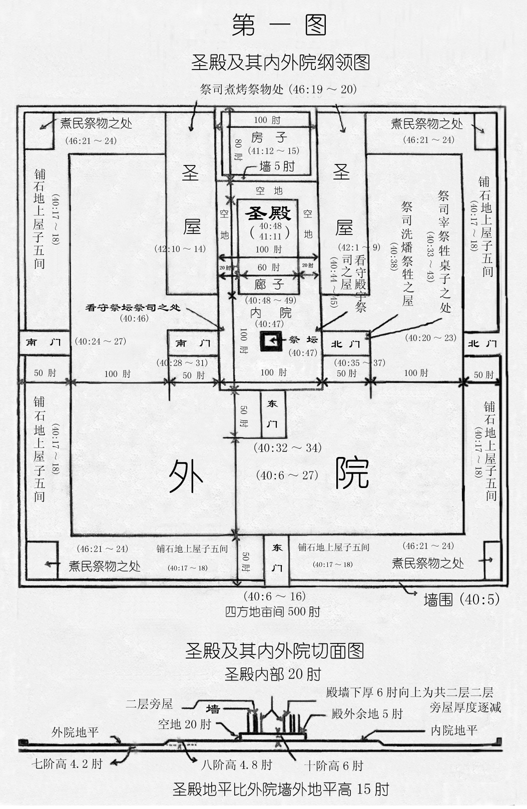 到了内院里面,“在内门旁,内院里有两间屋子,一间在北门旁,朝南,一间在南门旁,朝北。”(四十章四十四节原文。)这两间屋子是祭司们的住处。祭司分两等,一等看守殿宇