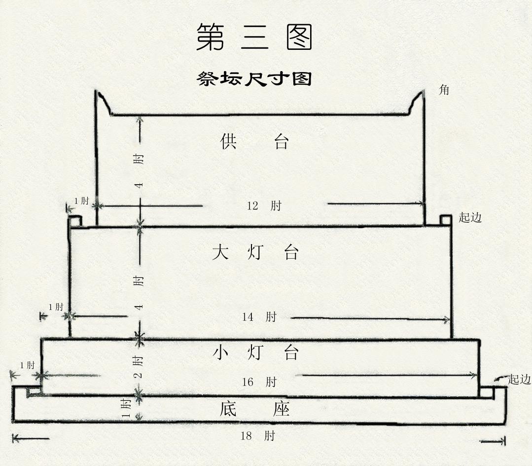 祭坛一共有四层。底下第一层是底座,第二层是小磴台,第三层是大磴,第四层是供台。这四层的大小尺寸,是从下面的基础,说到上面,而不是从上面说到下面。而且越在基础这里面积越大,越往上越收缩。这个含意就是说,非常的稳固,非常的稳重。一个东西,上大下小会摇来摇去;下大上小,就很稳定。十字架乃是一个基础,所以十字架必须是一个稳定的东西,而不该是摇来摇去的。